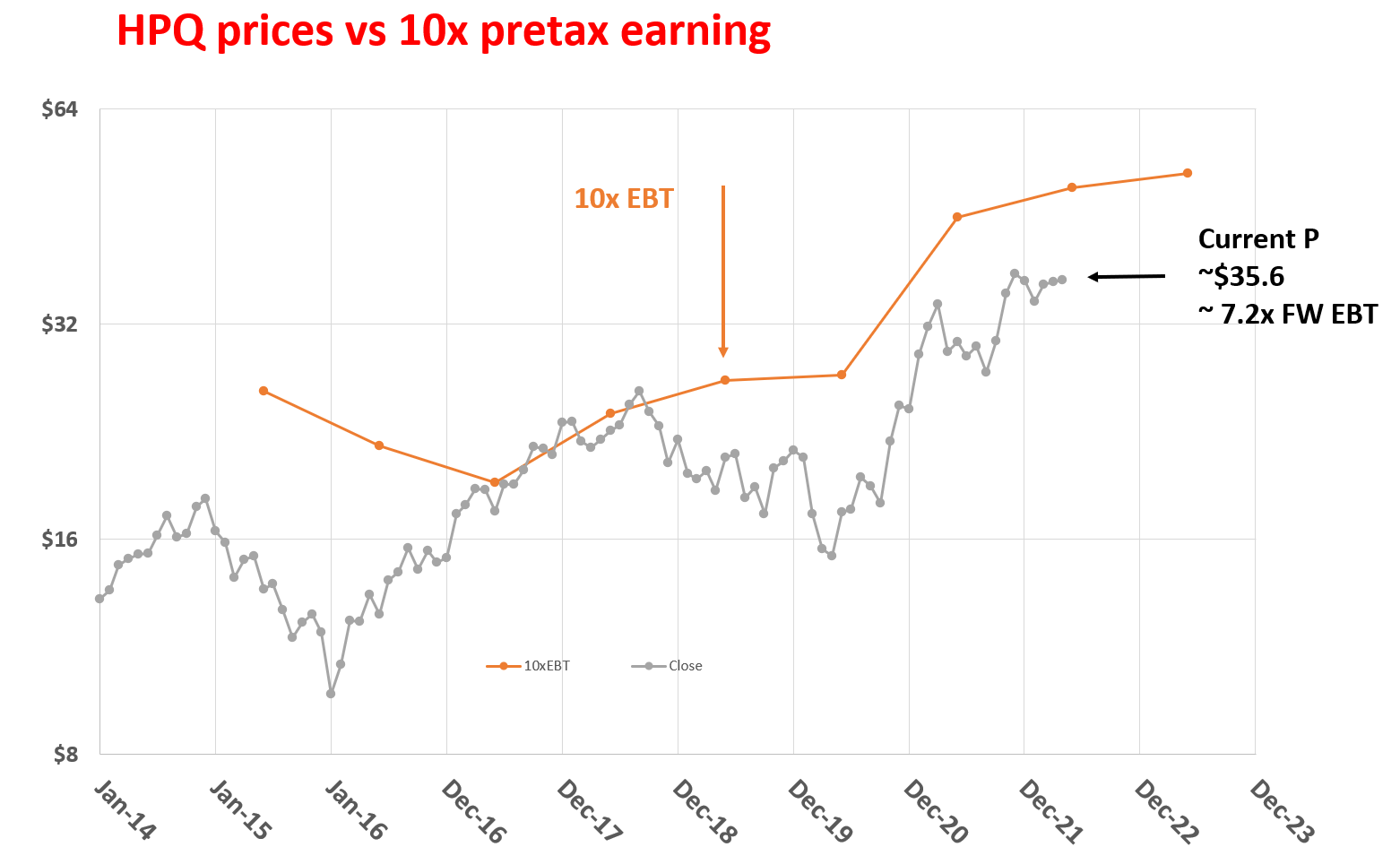 According to Buffett’s 10x pretax rule, HPQ is now a wonderful firm for sale at a wonderful price, as shown in the chart below. The figure compares HPQ’s historical price and its 10x pretax earnings (also referred to as EBT, Earnings Before Taxes). As seen, if the price has risen near or above 10x EBT, it has been a good time to sell like in 2016 and 2017. And vice versa, when the price fell below 10x EBT, it has been a favorable time to buy. And now, with a valuation of 7.2x FW EBT, is such a favorable time to buy. As to be detailed next, at 7.2x EBT, even if HPQ’s profits remain stagnated indefinitely, the investment would already produce an almost 14% pretax yield, comparable to a 14% equity bond.