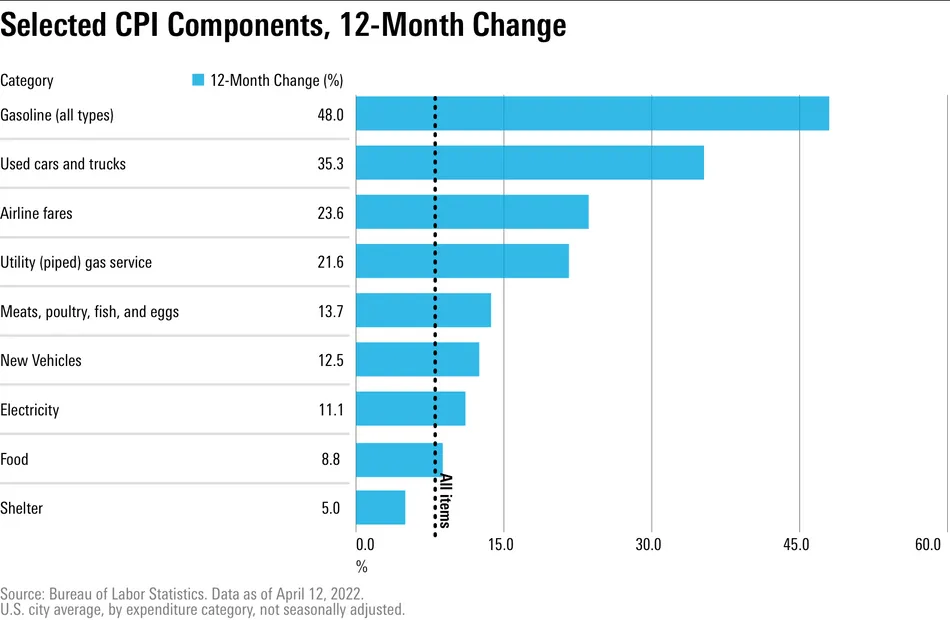 On a year-over-year basis, the 8.5% increase in the CPI was led by the jump in gasoline prices and saw meaningful increases elsewhere. Electricity costs were up 11.1%, food at home costs rose 10%, and food away from home rose 6.9%, all for the 12-month period ended in March.